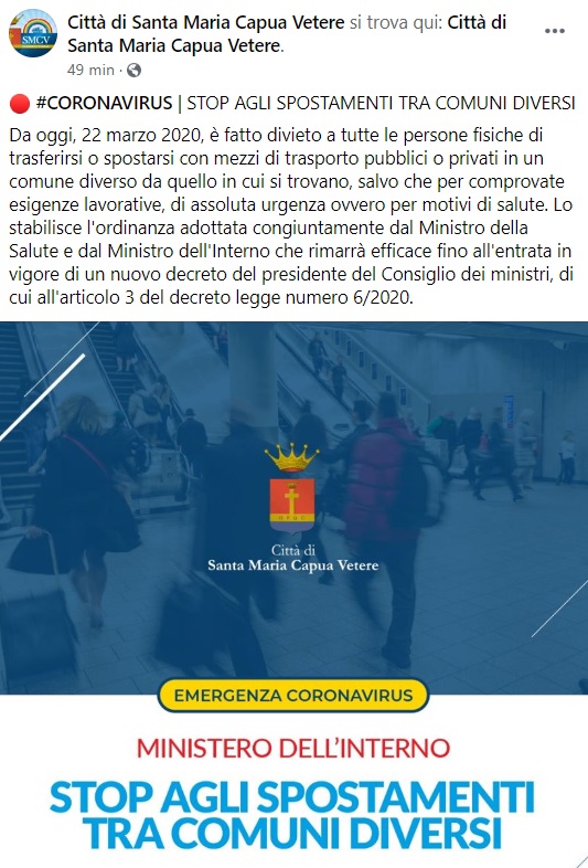 Coronavirus. "Stop agli spostamenti tra Comuni diversi"