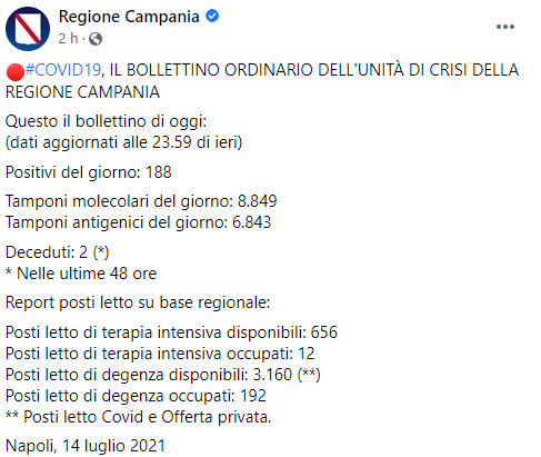 Questo il post pubblicato sulla pagina Facebook 'Regione Campania': "Covid-19, IL BOLLETTINO ORDINARIO DELL'UNITÀ DI CRISI DELLA REGIONE CAMPANIA Questo il bollettino di oggi: (dati aggiornati alle 23.59 di ieri) Positivi del giorno: 188 Tamponi molecolari del giorno: 8.849 Tamponi antigenici - si legge nel comunicato - del giorno: 6.843 Deceduti: 2 (*) * Nelle ultime 48 ore Report posti letto su base regionale: Posti letto di terapia intensiva disponibili: 656 Posti letto di terapia intensiva occupati: 12 Posti letto - si legge ancora - di degenza disponibili: 3.160 (**) Posti letto di degenza occupati: 192 ** Posti letto Covid e Offerta privata. Napoli, 14 luglio 2021".