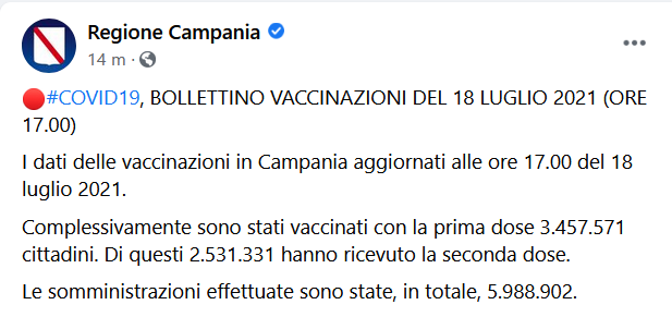 Questo il post pubblicato sulla pagina Facebook della Regione Campania: "COVID19, BOLLETTINO VACCINAZIONI DEL 18 LUGLIO 2021 (ORE 17.00)