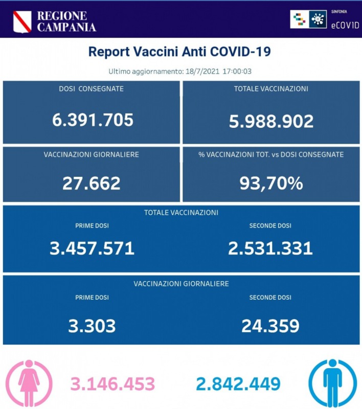 I dati delle vaccinazioni in Campania aggiornati alle ore 17.00 del 18 luglio 2021. Complessivamente - si legge nel post - sono stati vaccinati con la prima dose 3.457.571 cittadini. Di questi 2.531.331 hanno ricevuto la seconda dose. Le somministrazioni effettuate sono state, in totale, 5.988.902. I dati sono disponibili al link CLICCA QUI"