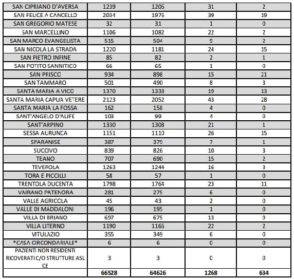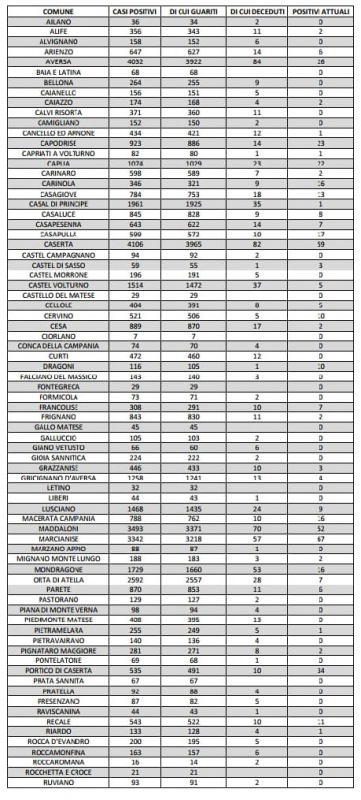 Questo il report odierno sulla situazione epidemiologica in Provincia pubblicato sul sito Web dell'Asl Caserta
