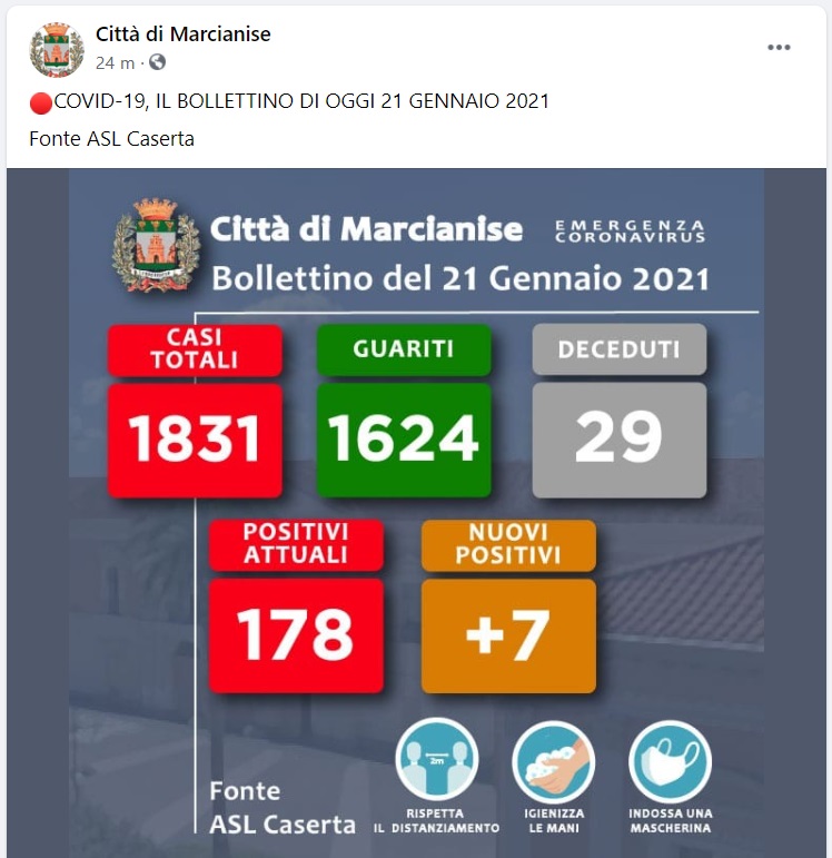 Questo quanto pubblicato sulla pagina fb del Comune di Marcianise: "COVID-19, IL BOLLETTINO DI OGGI - si legge nella nota - 21 GENNAIO 2021 Fonte ASL Caserta"