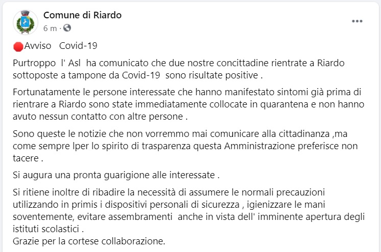 Questo quanto pubblicato dal Comune di Riardo