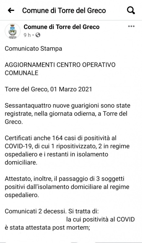 Lo apprendiamo dalla pagina Facebook del Comune di Torre del Greco: