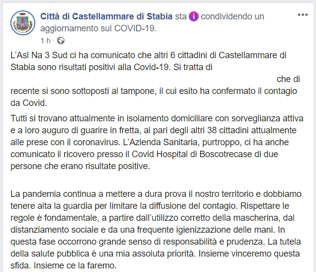 Questo quanto comunicato dal Comune di C.Stabia