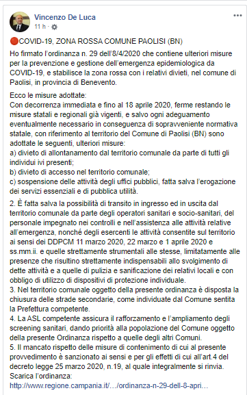 b) divieto di accesso nel territorio comunale; c) sospensione delle attività degli uffici pubblici, fatta salva l’erogazione dei servizi essenziali e di pubblica utilità. 2. È fatta salva la possibilità di transito in ingresso ed in uscita dal territorio comunale da parte degli operatori sanitari e socio-sanitari, del personale impegnato nei controlli e nell’assistenza alle attività relative all’emergenza, nonché degli esercenti le attività consentite sul territorio ai sensi dei DDPCM 11 marzo 2020, 22 marzo e 1 aprile 2020 e ss.mm.ii. e quelle strettamente strumentali alle stesse, limitatamente alle presenze che risultino strettamente indispensabili allo svolgimento di dette attività e a quelle di pulizia e sanificazione dei relativi locali e con obbligo di utilizzo di dispositivi di protezione individuale. 3. Nel territorio comunale oggetto della presente ordinanza è disposta la chiusura delle strade secondarie, come individuate dal Comune sentita la Prefettura competente. 4. La ASL competente assicura il rafforzamento e l’ampliamento degli screening sanitari, dando priorità alla popolazione del Comune oggetto della presente Ordinanza rispetto a quelle degli altri Comuni. 5. Il mancato rispetto delle misure di contenimento di cui al presente provvedimento è sanzionato ai sensi e per gli effetti di cui all’art.4 del decreto legge 25 marzo 2020, n.19, al quale integralmente si rinvia. Scarica l’ordinanza:http://www.regione.campania.it/…/ordinanza-n-29-dell-8-apri…"