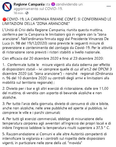Lo apprendiamo dalla pagina Facebook della Regione Campania.