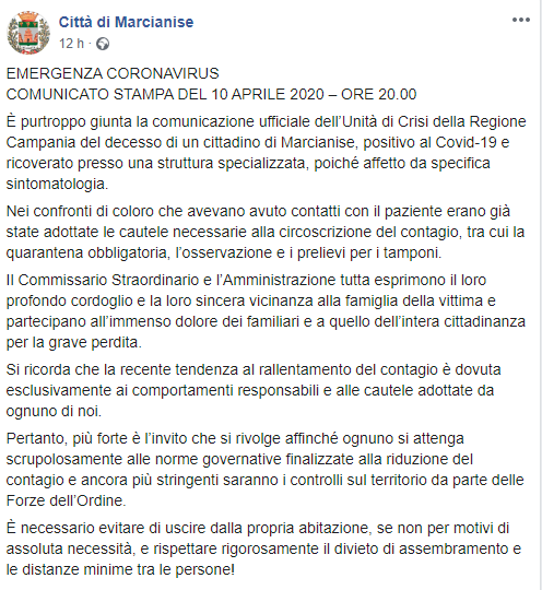 Questo il post pubblicato sulla pagina Facebook "Città di Marcianise":