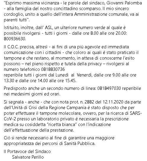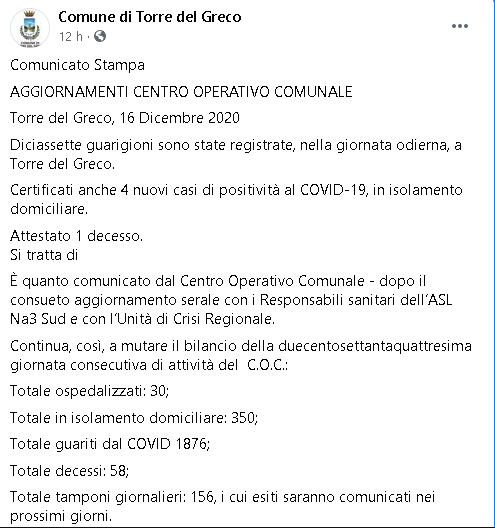 Lo apprendiamo dalla pagina Facebook Comune di Torre del Greco.
