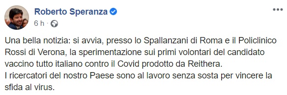 Questo quanto apprendiamo dalla pagina facebook del Ministro Speranza: