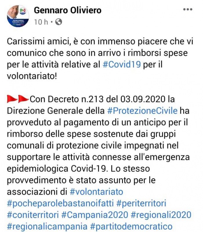 Questo quanto pubblicato dall'On. Gennaro Oliviero