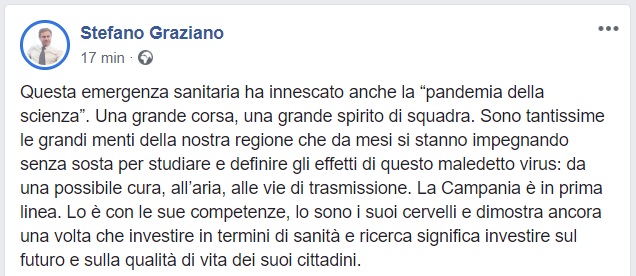 Covid-19. On. Graziano: "Campania in prima linea con sue competenze e cervelli"