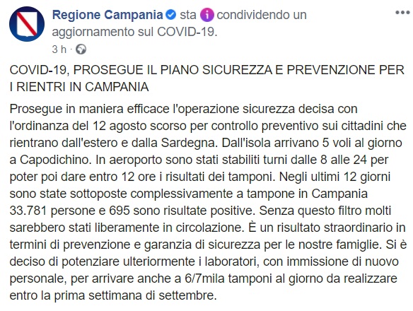 Questo quanto apprendiamo dalla pagina facebook della Regione Campania: