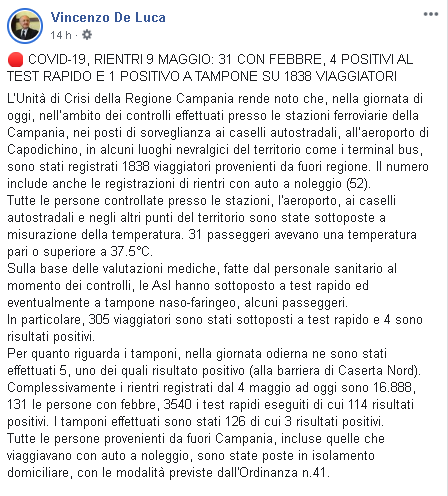 Lo apprendiamo dalla pagina Facebook del Governatore della Regione Campania, Vincenzo De Luca: