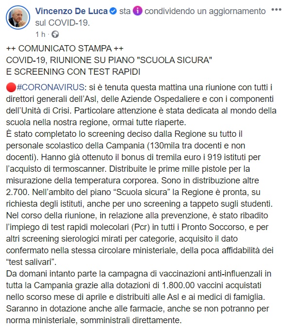 Questo quanto apprendiamo dalla pagina facebook del Pres. De Luca: