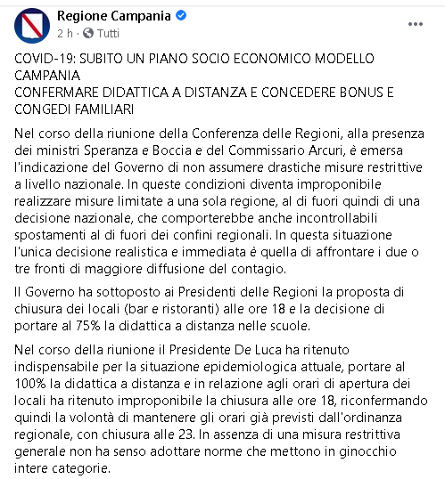 Lo apprendiamo dalla pagina Facebook della Regione Campania.