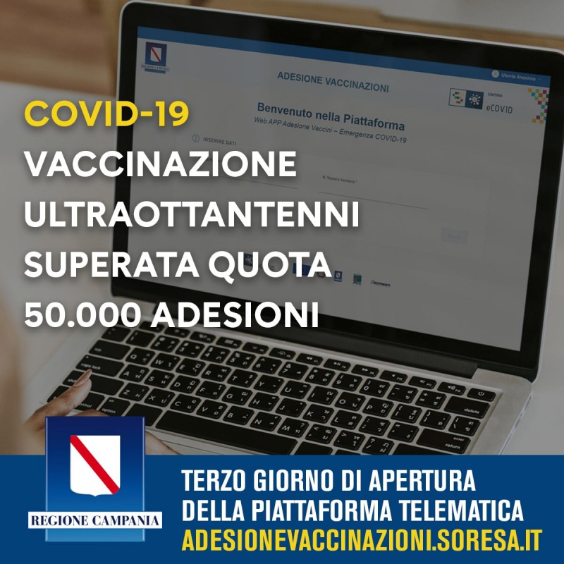 Questo quanto apprendiamo dalla pagina fb del Pres. De Luca: "COVID-19, VACCINAZIONE ULTRAOTTANTENNI SUPERATA QUOTA 50.000 ADESIONI (a cura dell’Unità di Crisi) Al terzo giorno di apertura della piattaforma telematica per l’adesione al piano vaccinazioni riservato ai cittadini campani che hanno 80 anni di età o più - si legge nella nota -, è stata già superata quota 50mila iscritti. Il link per prenotarsi è https://adesionevaccinazioni.soresa.it/. Possono aderire anche coloro che compiono gli 80 anni nell’arco del 2021. Al momento dell’adesione, è necessario fornire un indirizzo email e un recapito cellulare, che saranno utilizzati in fase di convocazione per la somministrazione della prima dose del vaccino. La piattaforma - si legge nella nota - richiede la verifica del numero di cellulare fornito tramite un codice inviato via SMS. Sarà cura del centro vaccinale procedere con la successiva convocazione, che avverrà al termine della prima fase della campagna, quindi al termine della somministrazione delle seconde dosi a chi si è già vaccinato con la prima."