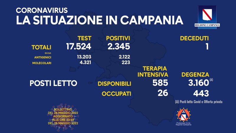 Questo il bollettino di oggi: (dati aggiornati alle 23.59 di ieri) Positivi del giorno: 2.345 di cui: Positivi all'antigenico: 2.122 Positivi al molecolare: 223 Test: 17.524 di cui: Antigenici: 13.203 - si legge nel post - Molecolari: 4.321 Deceduti: 1 Report posti letto su base regionale: Posti letto di terapia intensiva disponibili: 585 Posti letto di terapia intensiva occupati: 26 Posti letto di degenza disponibili: 3.160 (*) Posti letto di degenza occupati: 443 (*) Posti letto Covid - conclude il post - e Offerta privata".
