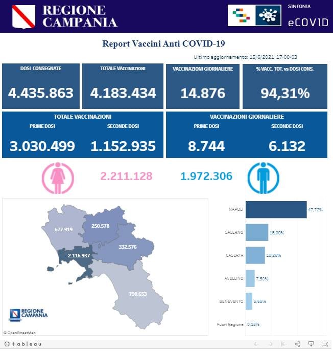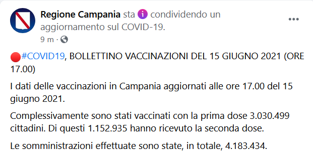 Questa parte del post pubblicato sulla pagina Facebook 'Regione Campania': "Covid 19, BOLLETTINO VACCINAZIONI DEL 15 GIUGNO 2021 (ORE 17.00) I dati delle vaccinazioni in Campania aggiornati alle ore 17.00 del 15 giugno 2021. Complessivamente sono stati vaccinati con la prima dose 3.030.499 cittadini. Di questi 1.152.935 hanno ricevuto la seconda dose. Le somministrazioni effettuate sono state, in totale, 4.183.434".