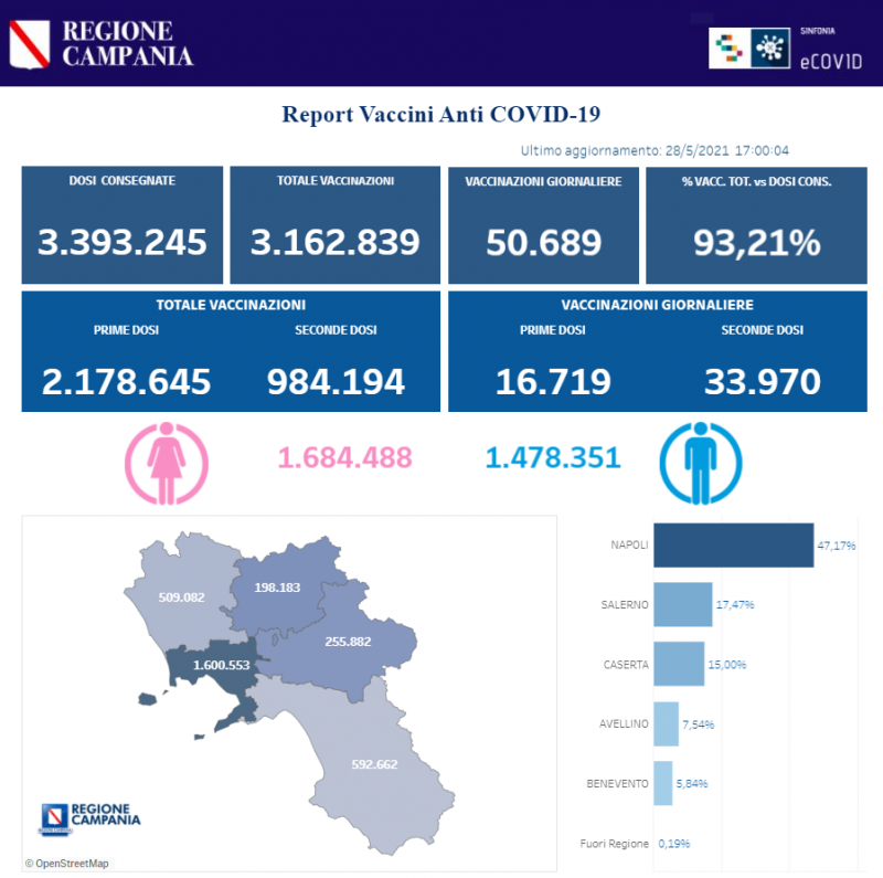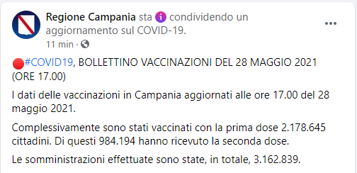 Questa parte del post pubblicato sulla pagina Facebook 'Regione Campania': "Covid-19, Bollettino vaccinazioni del 28 maggio 2021 (ore 17.00). I dati delle vaccinazioni in Campania aggiornati alle ore 17.00 del 28 maggio 2021. Complessivamente - si legge nel post - sono stati vaccinati con la prima dose 2.178.645 cittadini. Di questi 984.194 hanno ricevuto la seconda dose. Le somministrazioni effettuate sono state, in totale, 3.162.839".