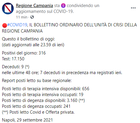 Deceduti: 9 (*) nelle ultime 48 ore; 7 deceduti in precedenza - si legge nel post - ma registrati ieri. Report posti letto su base regionale: Posti letto di terapia intensiva disponibili: 656 Posti letto di terapia intensiva occupati: 19 Posti letto di degenza disponibili: 3.160 (**) Posti letto di degenza occupati: 241 (**) Posti letto Covid - prosegue il post - e Offerta privata. Napoli, 29 settembre 2021".