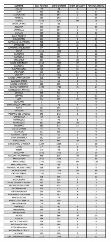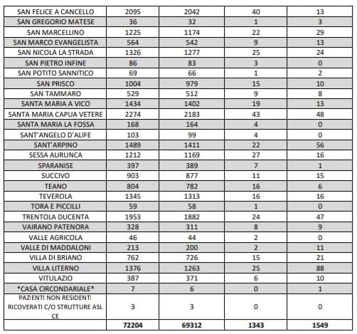 Questo il report odierno sulla situazione epidemiologica pubblicato sul sito web dell'Asl Caserta