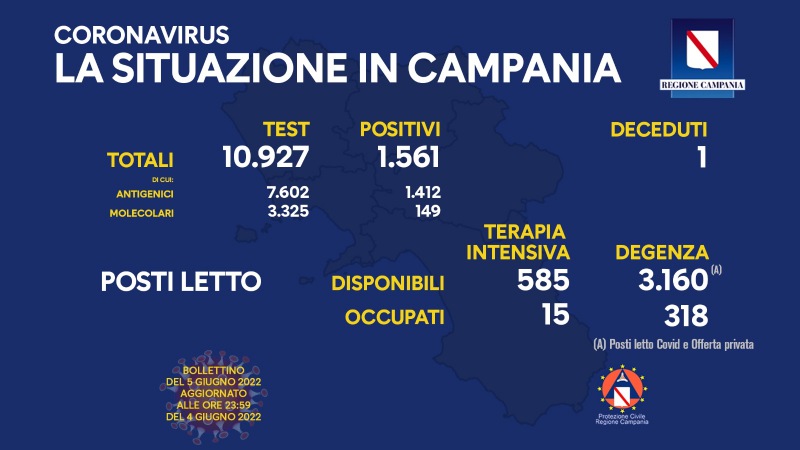 Questo il bollettino di oggi: (dati aggiornati alle 23.59 di ieri). Positivi del giorno: 1.561 di cui: Positivi all'antigenico: 1.412. Positivi al molecolare: 149. Test: 10.927 di cui: Antigenici: 7.602, Molecolari: 3.325. Deceduti: 1. Report posti letto su base regionale: Posti letto di terapia intensiva disponibili: 585, Posti letto di terapia intensiva occupati: 15, Posti letto di degenza disponibili: 3.160 (*), Posti letto di degenza occupati: 318, (*) Posti letto Covid e Offerta privata. I dati sulle vaccinazioni - si legge - sono disponibili al link: CLICCA QUI. Napoli, 5 giugno 2022".