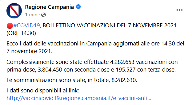 Questo il post pubblicato sulla pagina Facebook della Regione Campania: "COVID19, BOLLETTINO VACCINAZIONI DEL 7 NOVEMBRE 2021 (ORE 14.30) Ecco i dati delle vaccinazioni in Campania aggiornati alle ore 14.30 del 7 novembre 2021. Complessivamente - si legge nel post - sono state effettuate 4.282.653 vaccinazioni con prima dose, 3.804.450 con seconda dose e 195.527 con terza dose. Le somministrazioni sono state, in totale, 8.282.630. I dati sono disponibili al link: CLICCA QUI".