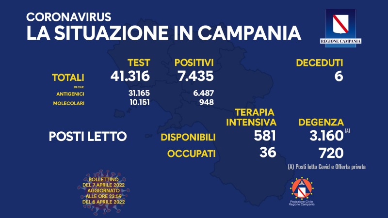 Questo il bollettino di oggi: (dati aggiornati alle 23.59 di ieri) Positivi del giorno: 7.435 di cui: Positivi all'antigenico: 6.487 Positivi al molecolare: 948 Test: 41.316 di cui: Antigenici: 31.165 Molecolari: 10.151 Deceduti: 6 Report posti letto - si legge nel post - su base regionale: Posti letto di terapia intensiva disponibili: 581 Posti letto di terapia intensiva occupati: 36 Posti letto di degenza disponibili: 3.160 (*) Posti letto di degenza occupati: 720 (*) Posti letto - conclude il post - Covid e Offerta privata".