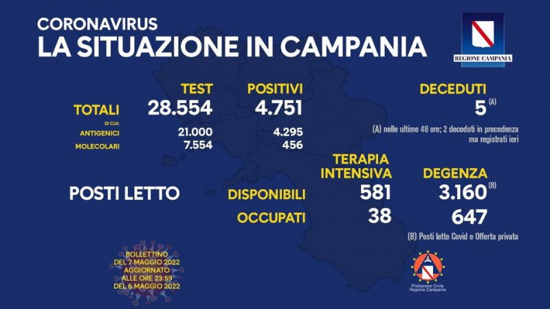 Questo il bollettino di oggi: (dati aggiornati alle 23.59 di ieri) Positivi del giorno: 4.751 di cui: Positivi all'antigenico: 4.295 Positivi al molecolare: 456 Test: 28.554 di cui: Antigenici: 21.000 Molecolari - si legge nel post 7.554 - Deceduti: 5 (*) nelle ultime 48 ore; 2 deceduti in precedenza ma registrati ieri. Report posti letto su base regionale: Posti letto di terapia intensiva disponibili: 581 Posti letto di terapia intensiva occupati: 38 Posti letto di degenza disponibili: 3.160 (*) Posti letto - conclude il post - di degenza occupati: 647 (*) Posti letto Covid e Offerta privata".