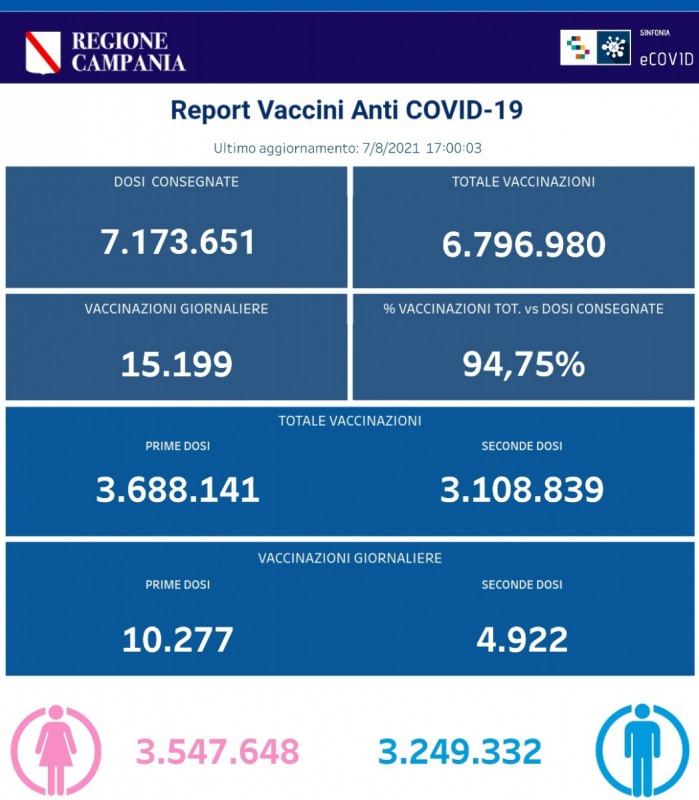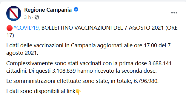 Questo il post pubblicato sulla pagina Facebook della Regione Campania: "COVID19 BOLLETTINO VACCINAZIONI DEL 7 AGOSTO 2021 (ORE 17) I dati delle vaccinazioni in Campania aggiornati alle ore 17.00 del 7 agosto 2021. Complessivamente - si legge - sono stati vaccinati con la prima dose 3.688.141 cittadini. Di questi 3.108.839 hanno ricevuto la seconda dose. Le somministrazioni effettuate sono state, in totale, 6.796.980. I dati sono disponibili al link CLICCA QUI".