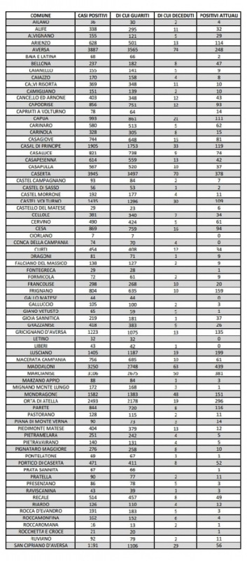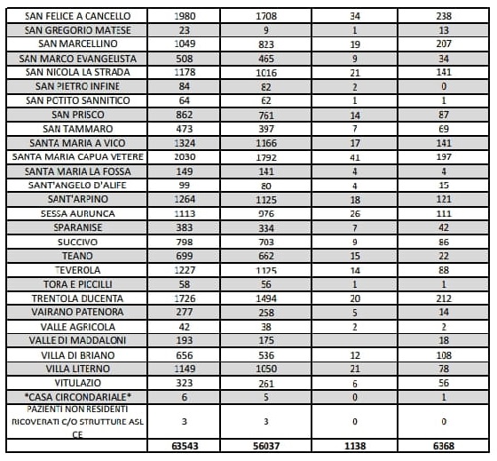 Questi i dati sulla situazione epidemiologica in Provincia pubblicati oggi dall'Asl Caserta