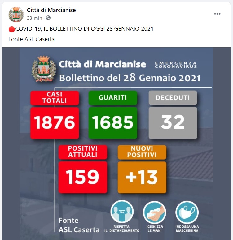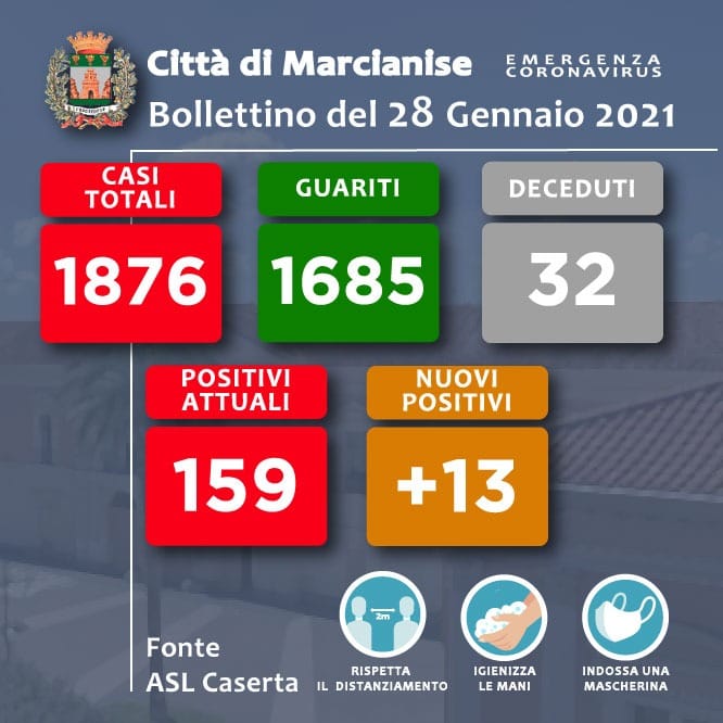 Questo quanto pubblicato sulla pagina fb Città di Marcianise: "COVID-19, IL BOLLETTINO DI OGGI 28 GENNAIO 2021 - si legge nella nota - Fonte ASL Caserta"