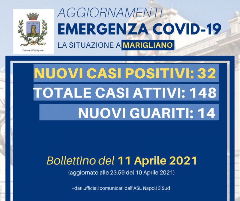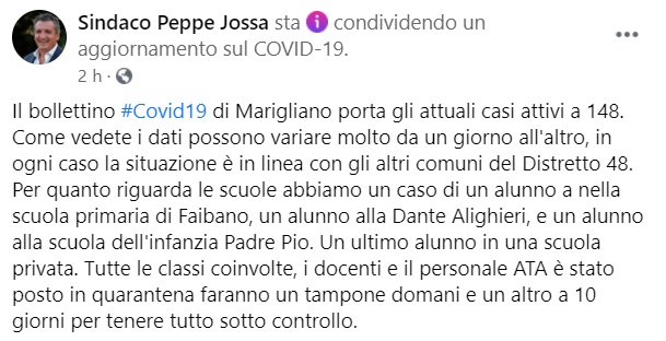 Questo quanto pubblicato sulla pagina fb del Sindaco Jossa: "Il bollettino Covid19 di Marigliano porta gli attuali casi attivi a 148. Come vedete i dati possono variare molto da un giorno all'altro - si legge nella nota -, in ogni caso la situazione è in linea con gli altri comuni del Distretto 48. Per quanto riguarda le scuole abbiamo un caso di un alunno nella scuola primaria di Faibano, un alunno alla Dante Alighieri, e un alunno alla scuola dell'infanzia Padre Pio. Un ultimo alunno in una scuola privata. Tutte le classi coinvolte, i docenti e il personale ATA è stato posto in quarantena - si legge nella nota - faranno un tampone domani e un altro a 10 giorni per tenere tutto sotto controllo.