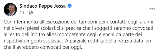 Con riferimento all'esecuzione dei tamponi per i contatti degli alunni nei diversi plessi scolastici si precisa che i soggetti saranno convocati all'esito dell'inoltro all'Asl competente - si legge nella nota - degli elenchi da parte dei rispettivi dirigenti scolastici. A parziale rettifica della notizia data ieri che li avrebbero convocati per oggi."
