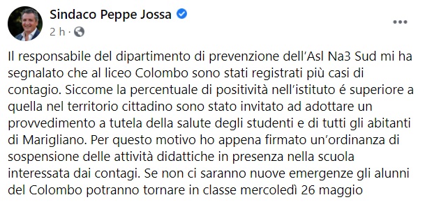 Questo quanto apprendiamo dalla pagina fb del Sindaco di Marigliano: "Il responsabile del dipartimento di prevenzione dell’Asl Na3 Sud mi ha segnalato che al liceo Colombo sono stati registrati più casi di contagio. Siccome la percentuale di positività nell’istituto é superiore a quella nel territorio cittadino sono stato invitato ad adottare un provvedimento a tutela della salute degli studenti e di tutti gli abitanti di Marigliano. Per questo motivo ho appena firmato un’ordinanza di sospensione delle attività didattiche in presenza nella scuola interessata dai contagi. Se non ci saranno nuove emergenze gli alunni del Colombo potranno tornare in classe mercoledì 26 maggio"
