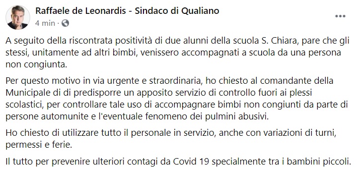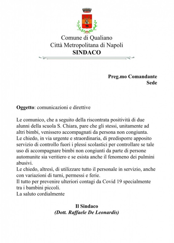A seguito della riscontrata positività di due alunni della scuola S. Chiara, pare che gli stessi, unitamente ad altri bimbi, venissero accompagnati a scuola da una persona non congiunta. Per questo motivo - si legge nella nota - in via urgente e straordinaria, ho chiesto al comandante della Municipale di predisporre un apposito servizio di controllo fuori ai plessi scolastici, per controllare tale uso di accompagnare bimbi non congiunti da parte di persone automunite e l'eventuale fenomeno dei pulmini abusivi. Ho chiesto di utilizzare tutto il personale in servizio, anche con variazioni di turni - si legge nella nota -, permessi e ferie. Il tutto per prevenire ulteriori contagi da Covid 19 specialmente tra i bambini piccoli."