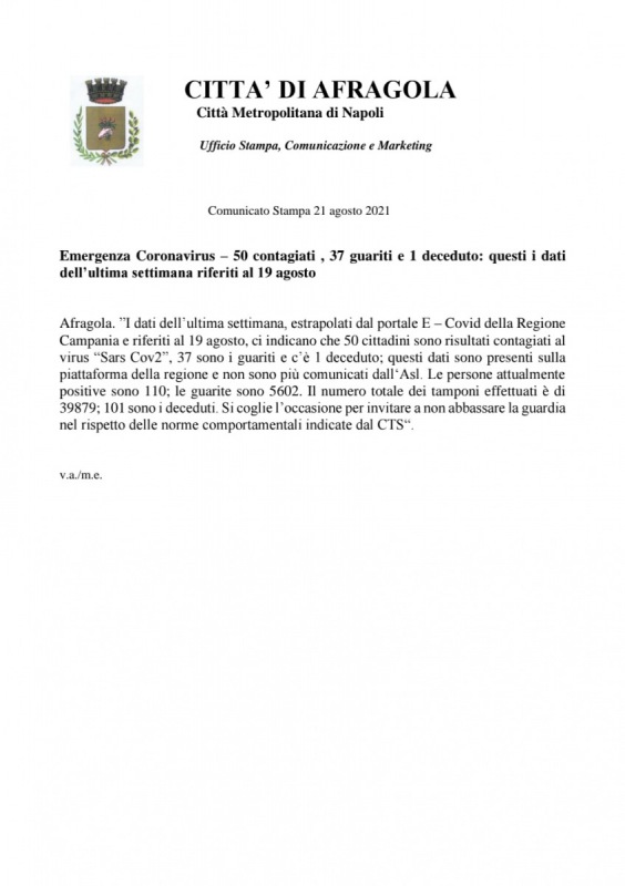 Questo il report sulla situazione epidemiologica in città dell'ultima settimana pubblicato sulla pagina Facebook 'Comune di Afragola'