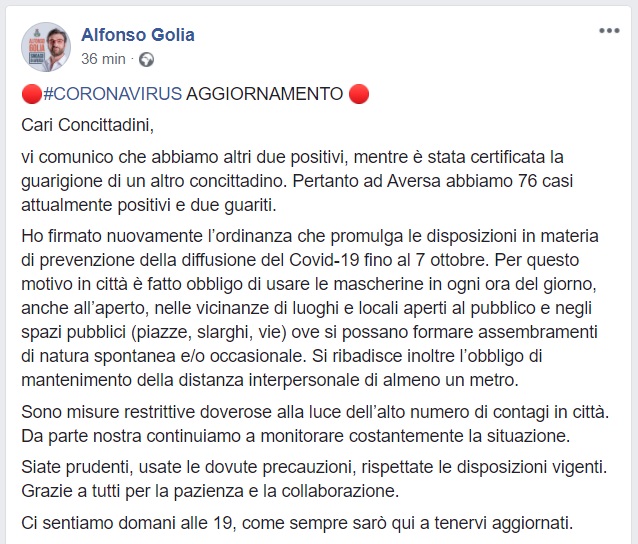 Questo quanto comunicato dal Sindaco di Aversa Golia