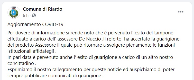Questo quanto pubblicato sulla pagina fb del Comune di Riardo