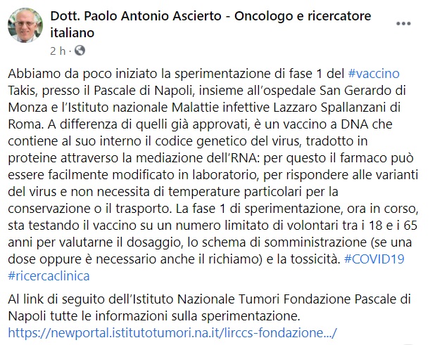 "Abbiamo da poco iniziato la sperimentazione di fase 1 del #vaccino Takis, presso il Pascale di Napoli, insieme all’ospedale San Gerardo di Monza e l’Istituto nazionale Malattie infettive Lazzaro Spallanzani di Roma. A differenza di quelli già approvati, è- si legge nella nota- un vaccino a DNA che contiene al suo interno il codice genetico del virus, tradotto in proteine attraverso la mediazione dell’RNA: per questo il farmaco può essere facilmente modificato in laboratorio, per rispondere alle varianti del virus e non necessita di temperature particolari per la conservazione o il trasporto. La fase 1 di sperimentazione, ora in corso, sta testando- si legge nella nota- il vaccino su un numero limitato di volontari tra i 18 e i 65 anni per valutarne il dosaggio, lo schema di somministrazione (se una dose oppure è necessario anche il richiamo) e la tossicità. #COVID19 #ricercaclinica"