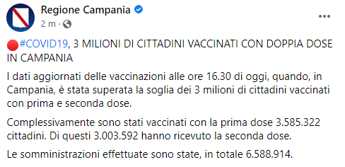 Questo parte del post pubblicato sulla pagina Facebook Regione Campania: "Covid-19 3 MILIONI DI CITTADINI VACCINATI CON DOPPIA DOSE IN CAMPANIA I dati aggiornati delle vaccinazioni alle ore 16.30 di oggi, quando, in Campania, è stata superata la soglia dei 3 milioni di cittadini vaccinati con prima e seconda dose. Complessivamente - si legge nel post - sono stati vaccinati con la prima dose 3.585.322 cittadini. Di questi 3.003.592 hanno ricevuto la seconda dose. Le somministrazioni effettuate sono state, in totale 6.588.914".