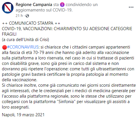 Questo il Comunicato stampa pubblicato ieri dalla Regione Campania: "Covid-19, vaccinazioni. Chiarimento su adesione categorie fragili (a cura dell’Unità di Crisi). Coronavirus: si chiarisce che i cittadini campani appartenenti alla fascia di età 70-79 anni che hanno già aderito alla vaccinazione sulla piattaforma a loro riservata, nel caso in cui si trattasse di pazienti con disabilità grave - si legge nella nota - sono già presi in carico dal sistema e non dovranno più ripetere l'operazione: come tutti gli ultrasettantenni con patologie gravi basterà certificare la propria patologia al momento della vaccinazione. Si chiarisce inoltre, come già comunicato nei giorni scorsi direttamente agli interessati, che le credenziali per i medici di medicina generale per l'accesso alla piattaforma regionale - prosegue la nota - , sono le stesse che utilizzano per collegarsi con la piattaforma "Sinfonia" per visualizzare gli assistiti a loro assegnati".
