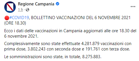 Questo parte del post pubblicato sulla pagina Facebook 'Regione Campania': "Covid-19, BOLLETTINO VACCINAZIONI DEL 6 NOVEMBRE 2021 (ORE 18.30) Ecco i dati delle vaccinazioni in Campania - si legge nel post - aggiornati alle ore 18.30 del 6 novembre 2021. Complessivamente sono state effettuate 4.281.879 vaccinazioni con prima dose, 3.802.243 con seconda dose e 191.761 con terza dose. Le somministrazioni sono state, in totale, 8.275.883 (...)".