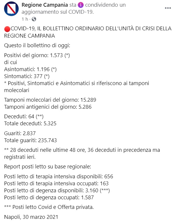 Questo quanto apprediamo dalla pagina fb della Regione Campania: "COVID-19, IL BOLLETTINO ORDINARIO DELL'UNITÀ DI CRISI DELLA REGIONE CAMPANIA Questo il bollettino di oggi: Positivi del giorno: 1.573 (*) di cui Asintomatici: 1.196 (*) Sintomatici: 377 (*) * Positivi, Sintomatici e Asintomatici si riferiscono ai tamponi molecolari Tamponi molecolari del giorno: 15.289 Tamponi antigenici del giorno: 5.286 Deceduti: 64 (**) Totale deceduti: 5.325 Guariti: 2.837 Totale guariti: 235.743 ** 28 deceduti nelle ultime 48 ore, 36 deceduti in precedenza ma registrati ieri. Report posti letto su base regionale: Posti letto di terapia intensiva disponibili: 656 Posti letto di terapia intensiva occupati: 163 Posti letto di degenza disponibili: 3.160 (***) Posti letto di degenza occupati: 1.587 *** Posti letto Covid e Offerta privata. Napoli, 30 marzo 2021"