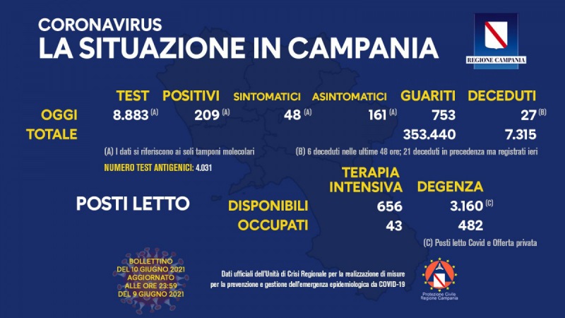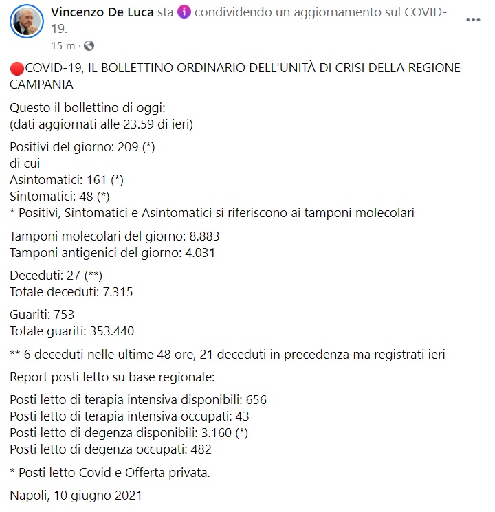 Questo quanto apprendiamo dalla pagina fb del Pres. De Luca: "COVID-19, IL BOLLETTINO ORDINARIO DELL'UNITÀ DI CRISI DELLA REGIONE CAMPANIA Questo il bollettino di oggi: (dati aggiornati alle 23.59 di ieri) Positivi del giorno: 209 (*) di cui Asintomatici: 161 (*) Sintomatici: 48 (*) * Positivi, Sintomatici e Asintomatici si riferiscono ai tamponi molecolari Tamponi molecolari del giorno: 8.883 Tamponi antigenici del giorno: 4.031 Deceduti: 27 (**) Totale deceduti: 7.315 Guariti: 753 Totale guariti: 353.440 ** 6 deceduti nelle ultime 48 ore, 21 deceduti in precedenza ma registrati ieri Report posti letto su base regionale: Posti letto di terapia intensiva disponibili: 656 Posti letto di terapia intensiva occupati: 43 Posti letto di degenza disponibili: 3.160 (*) Posti letto di degenza occupati: 482 * Posti letto Covid e Offerta privata. Napoli, 10 giugno 2021"