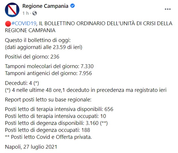 Questo quanto pubblicato sulla pagina fb della Reg. Campania: "COVID19, IL BOLLETTINO ORDINARIO DELL'UNITÀ DI CRISI DELLA REGIONE CAMPANIA Questo il bollettino di oggi: (dati aggiornati alle 23.59 di ieri) Positivi del giorno: 236 Tamponi molecolari del giorno: 7.330 Tamponi antigenici del giorno: 7.956 Deceduti: 4 (*) (*) 4 nelle ultime 48 ore,1 deceduto in precedenza ma registrato ieri Report posti letto su base regionale: Posti letto di terapia intensiva disponibili: 656 Posti letto di terapia intensiva occupati: 10 Posti letto di degenza disponibili: 3.160 (**) Posti letto di degenza occupati: 188 ** Posti letto Covid e Offerta privata. Napoli, 27 luglio 2021"