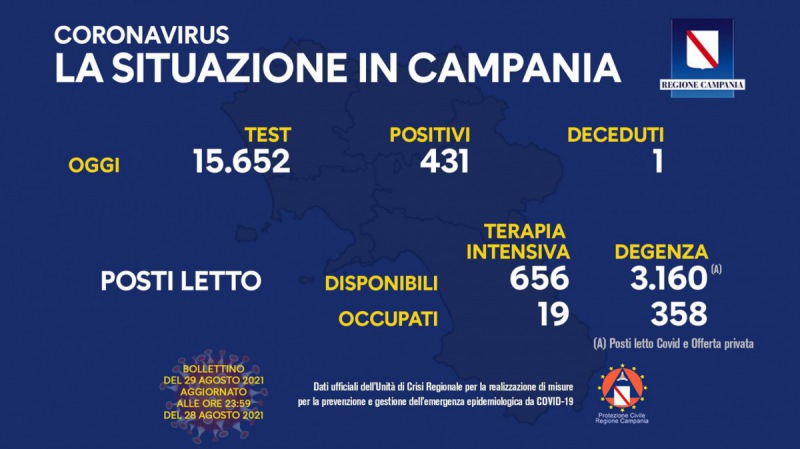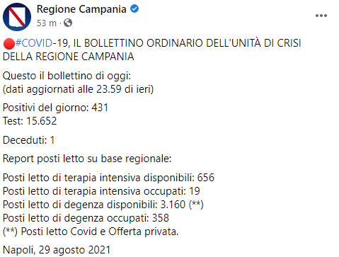 Deceduti: 1 Report posti letto su base regionale: Posti letto - si legge nel post - di terapia intensiva disponibili: 656 Posti letto di terapia intensiva occupati: 19 Posti letto di degenza disponibili: 3.160 (**) Posti letto di degenza - prosegue il post - occupati: 358 (**) Posti letto Covid e Offerta privata. Napoli, 29 agosto 2021".
