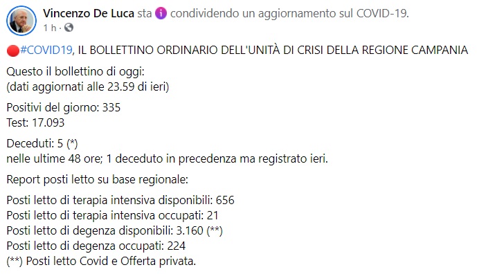 Questo quanto apprendiamo dalla pagina fb del Pres. De Luca: "COVID19, IL BOLLETTINO ORDINARIO DELL'UNITÀ DI CRISI DELLA REGIONE CAMPANIA Questo il bollettino di oggi: (dati aggiornati alle 23.59 di ieri) Positivi del giorno: 335 Test: 17.093 Deceduti: 5 (*) nelle ultime 48 ore; 1 deceduto in precedenza ma registrato ieri. Report posti letto su base regionale: Posti letto di terapia intensiva disponibili: 656 Posti letto di terapia intensiva occupati: 21 Posti letto di degenza disponibili: 3.160 (**) Posti letto di degenza occupati: 224 (**) Posti letto Covid e Offerta privata."