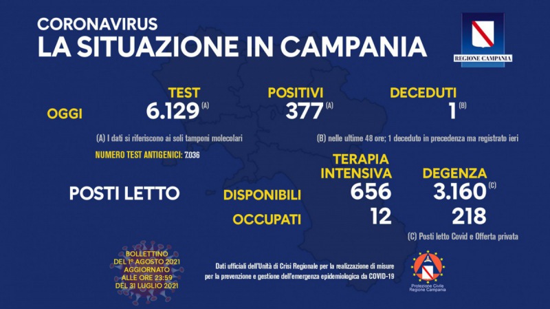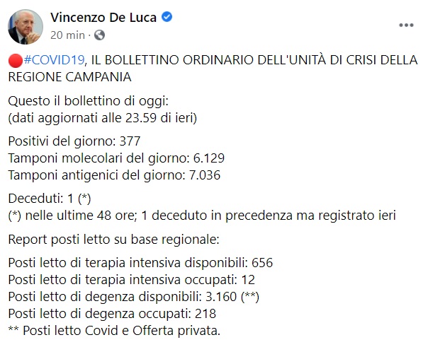 Questo quanto apprendiamo dalla pagina fb del Pres. De Luca: "COVID19, IL BOLLETTINO ORDINARIO DELL'UNITÀ DI CRISI DELLA REGIONE CAMPANIA Questo il bollettino di oggi: (dati aggiornati alle 23.59 di ieri) Positivi del giorno: 377 Tamponi molecolari del giorno: 6.129 Tamponi antigenici del giorno: 7.036 Deceduti: 1 (*) (*) nelle ultime 48 ore; 1 deceduto in precedenza ma registrato ieri Report posti letto su base regionale: Posti letto di terapia intensiva disponibili: 656 Posti letto di terapia intensiva occupati: 12 Posti letto di degenza disponibili: 3.160 (**) Posti letto di degenza occupati: 218 ** Posti letto Covid e Offerta privata."